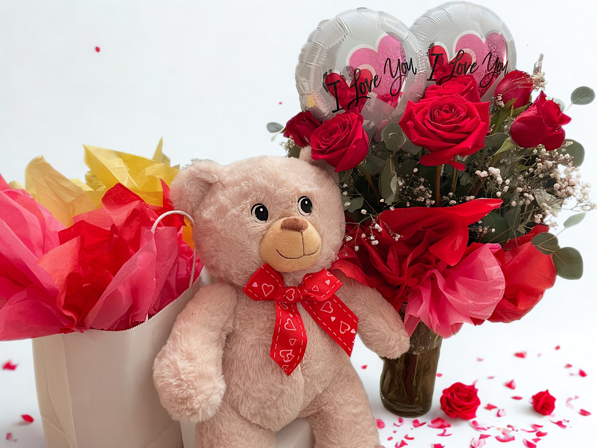 Say "I Love You" with a Dozen Red Roses w/Baby Breaths in a Gorgeous Vase w/ Two "I Love You" Balloons, and a Large Adorably Cute Teddy Bear delivered in a decorative gift bag filled with tissue paper